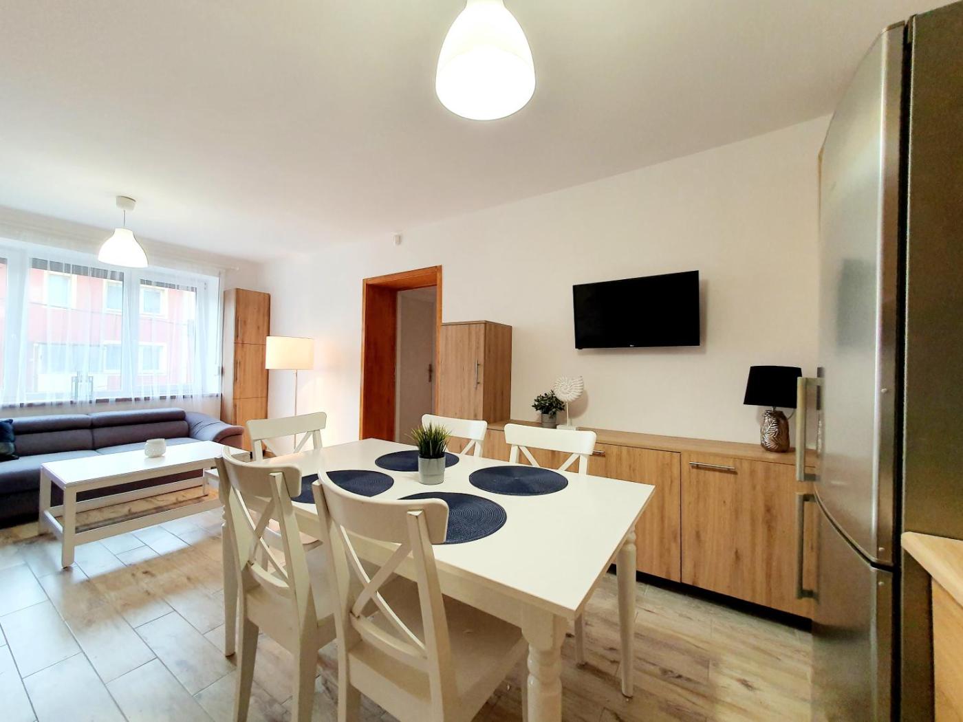 Apartament z 3 sypialniami. This spacious apartment comes with 1 living room, 3 separate bedrooms and 1 bathroom with a bath or a shower. The apartments kitchen, which features a refrigerator and kitchenware, is available for cooking and storing food. This apartment has a washing machine, heating and a flat-screen TV. The unit has 4 beds. Apartament - 8 osobowy. Powierzchnia pokoju ok.: 70 mkw.