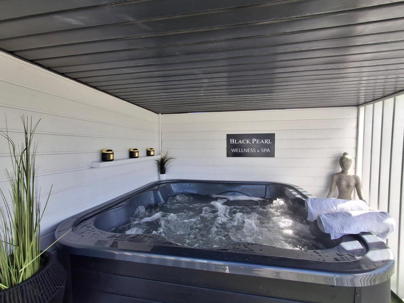 Zaplecze odnowy biologicznej obiektu Domki Black Pearl Mielno basen sauna jacuzzi obejmuje saunę i wannę z hydromasażem.